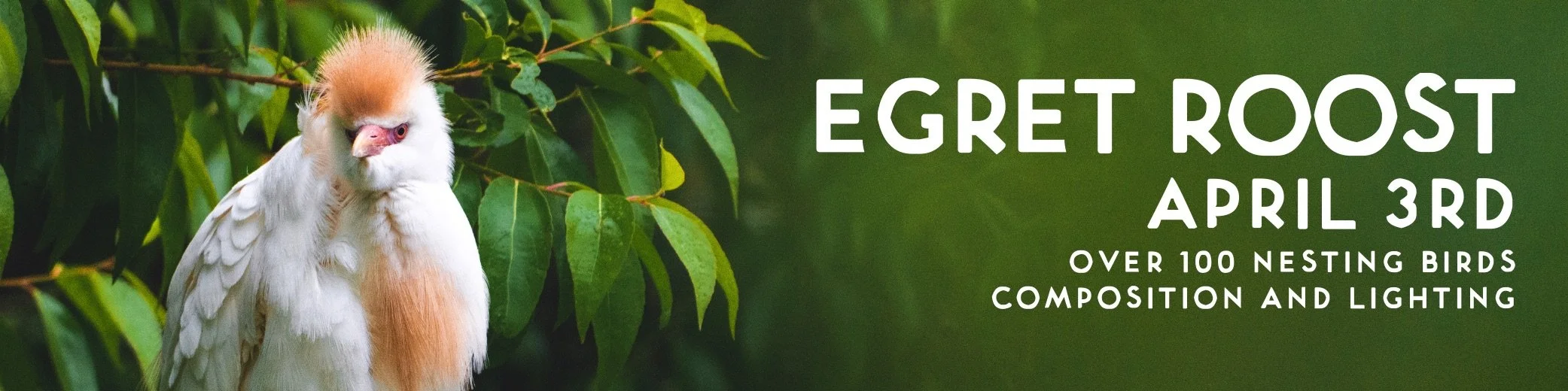 In this workshop, you’ll be learning how to capture Birds in flight as they come back and forth to the nest, as well as learning how to incorporate different compositional and lighting elements to create ideal photos of Egrets in the thick of the roost. This workshop is hosted at a public park, making it by far the easiest and most accessible workshop I host, giving us extra time to learn and implement photo techniques without worrying about the birds flying away on us.